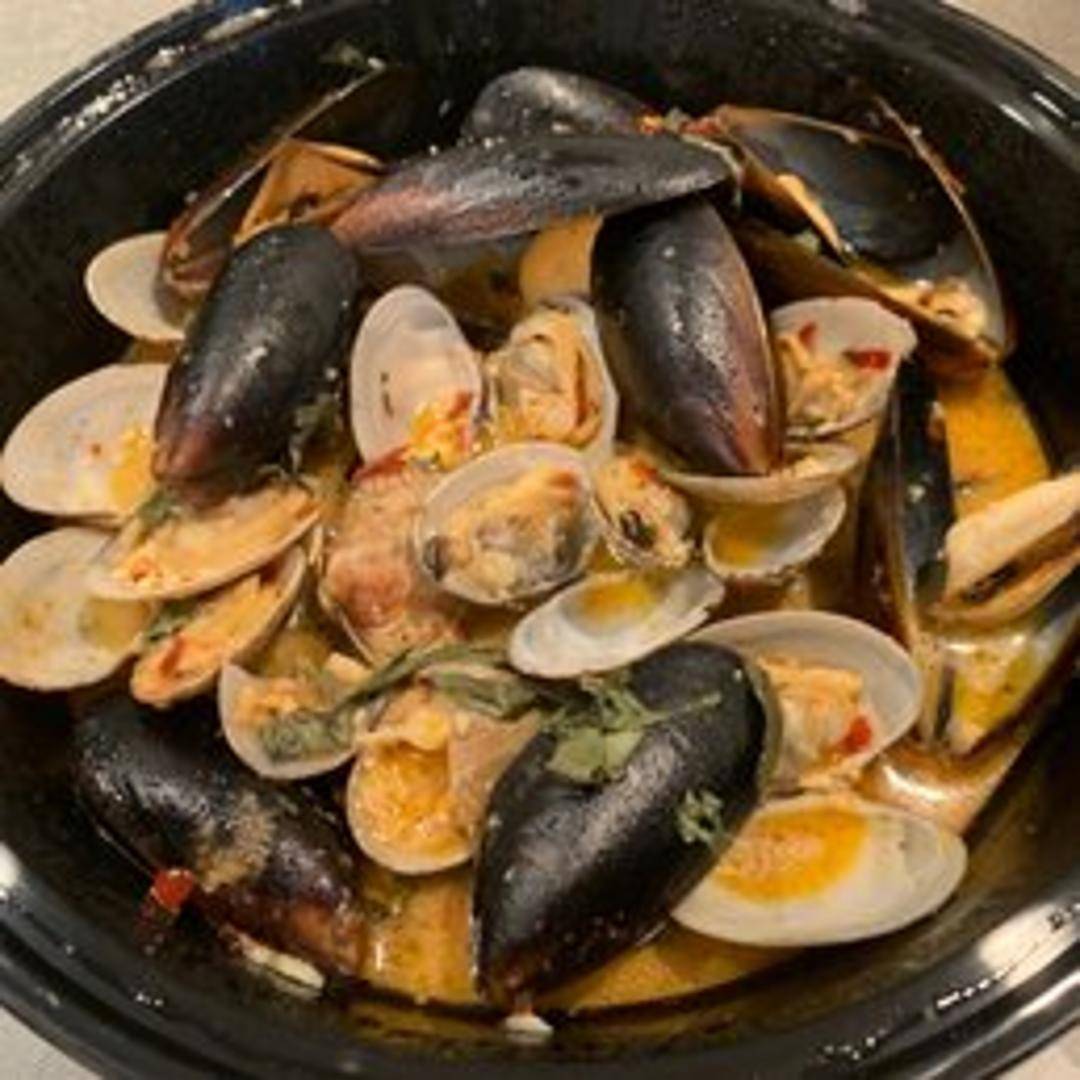 A delightful combination of succulent littleneck clams and tender mussels, steamed to perfection in your choice of a fragrant white wine garlic butter sauce or a zesty spicy marinara. Served with crusty bread for dipping, this dish offers a taste of the ocean with every savory bite.