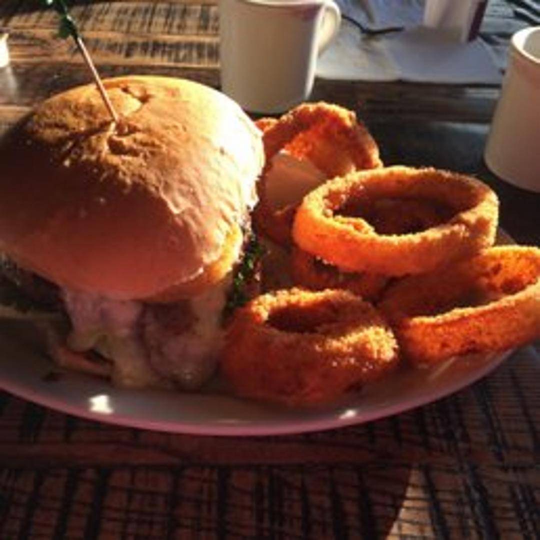 A hearty burger piled high with crispy bacon, cheddar cheese, onion rings, and a tangy BBQ sauce, all served on a toasted bun.