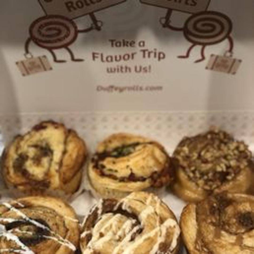 Our signature Duffeyroll, filled with a blend of cinnamon and spices, then generously drizzled with a rich, creamy maple frosting.