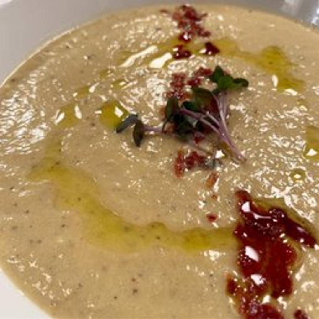 A creamy and smooth soup made with fresh leeks, vegetable broth, and cream, delicately seasoned for a rich and comforting flavor. Served hot.