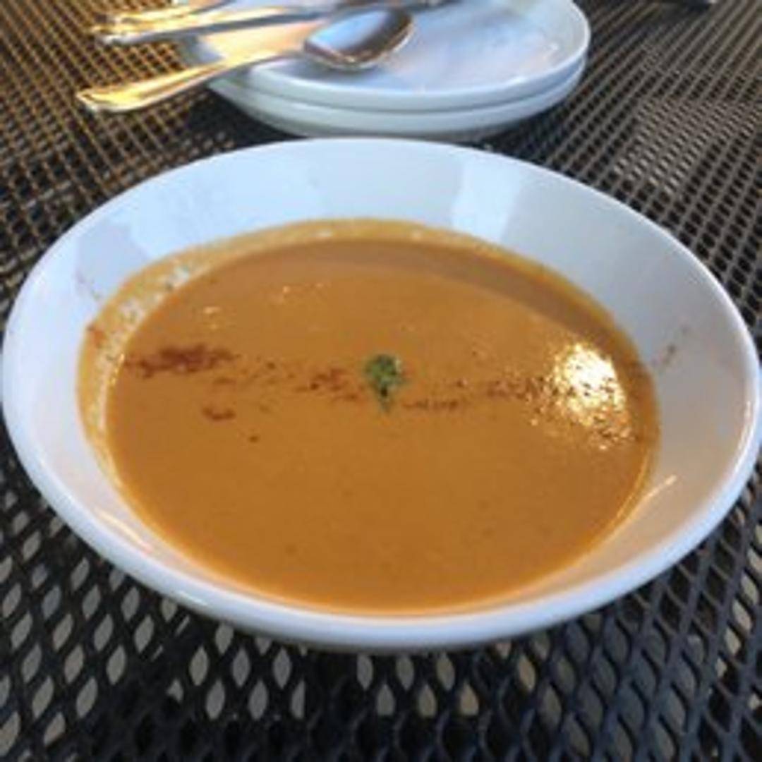 A creamy and flavorful soup featuring roasted red peppers, blended with a rich vegetable broth and a hint of cream. Garnished with fresh herbs.