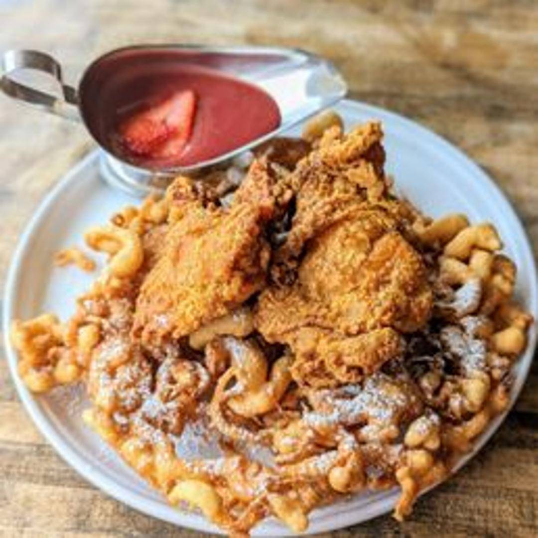 A unique dish featuring crispy fried chicken paired with sweet and fluffy funnel cake. The chicken provides a savory, often seasoned or breaded, counterpoint to the sugary, fried dough of the funnel cake. This combination offers a delightful mix of textures and flavors, balancing salty and sweet in a single serving. May be served with syrup, powdered sugar, or other toppings.