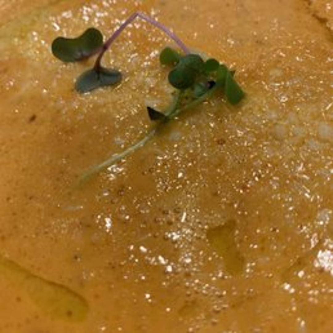 A creamy and flavorful soup featuring roasted red peppers and ripe tomatoes, blended to a smooth, velvety texture. Garnished with fresh herbs and a swirl of cream.
