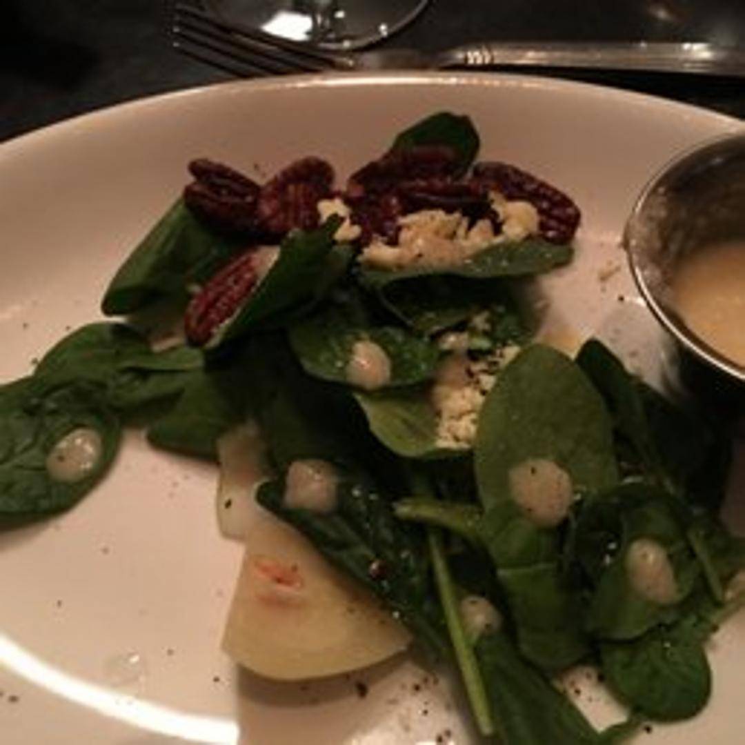 Fresh baby spinach tossed with sliced pears, candied pecans, crumbled goat cheese, and a light vinaigrette dressing.