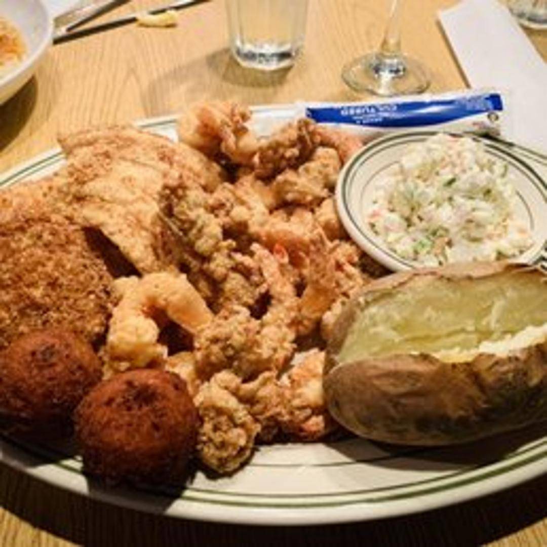 A generous assortment of crispy, golden-fried seafood including fish, shrimp, oysters, scallops, and clam strips. Served with fries, coleslaw, and hushpuppies.