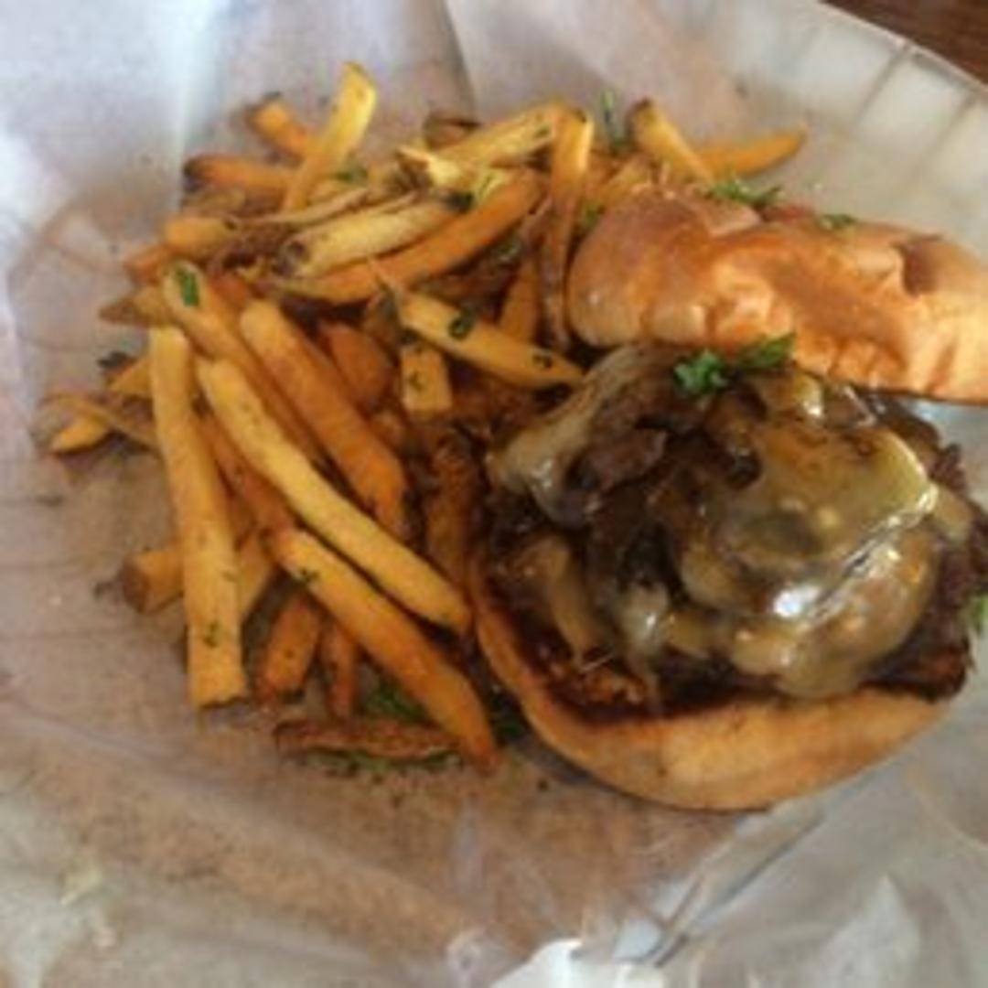 Beef patty, miso glazed mushrooms, caramelized onions, swiss cheese and garlic aioli on a toasted brioche bun.
