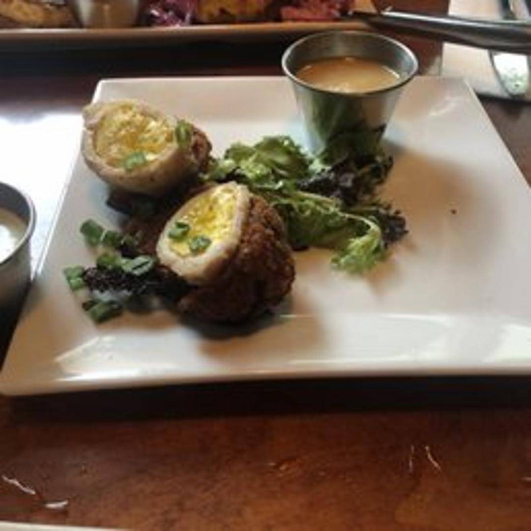 A classic pub favorite! A hard-boiled egg wrapped in seasoned sausage, coated in breadcrumbs, and deep-fried to golden perfection. Served with a side of tangy mustard for dipping. A savory and satisfying snack or appetizer.