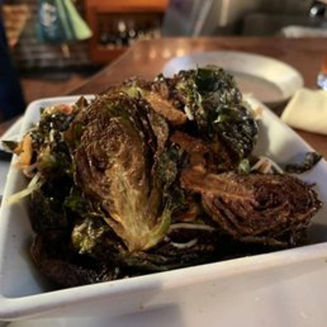 Perfectly crispy Brussels sprouts, tossed in a sweet and savory balsamic glaze. Garnished with toasted pecans and a sprinkle of parmesan cheese.