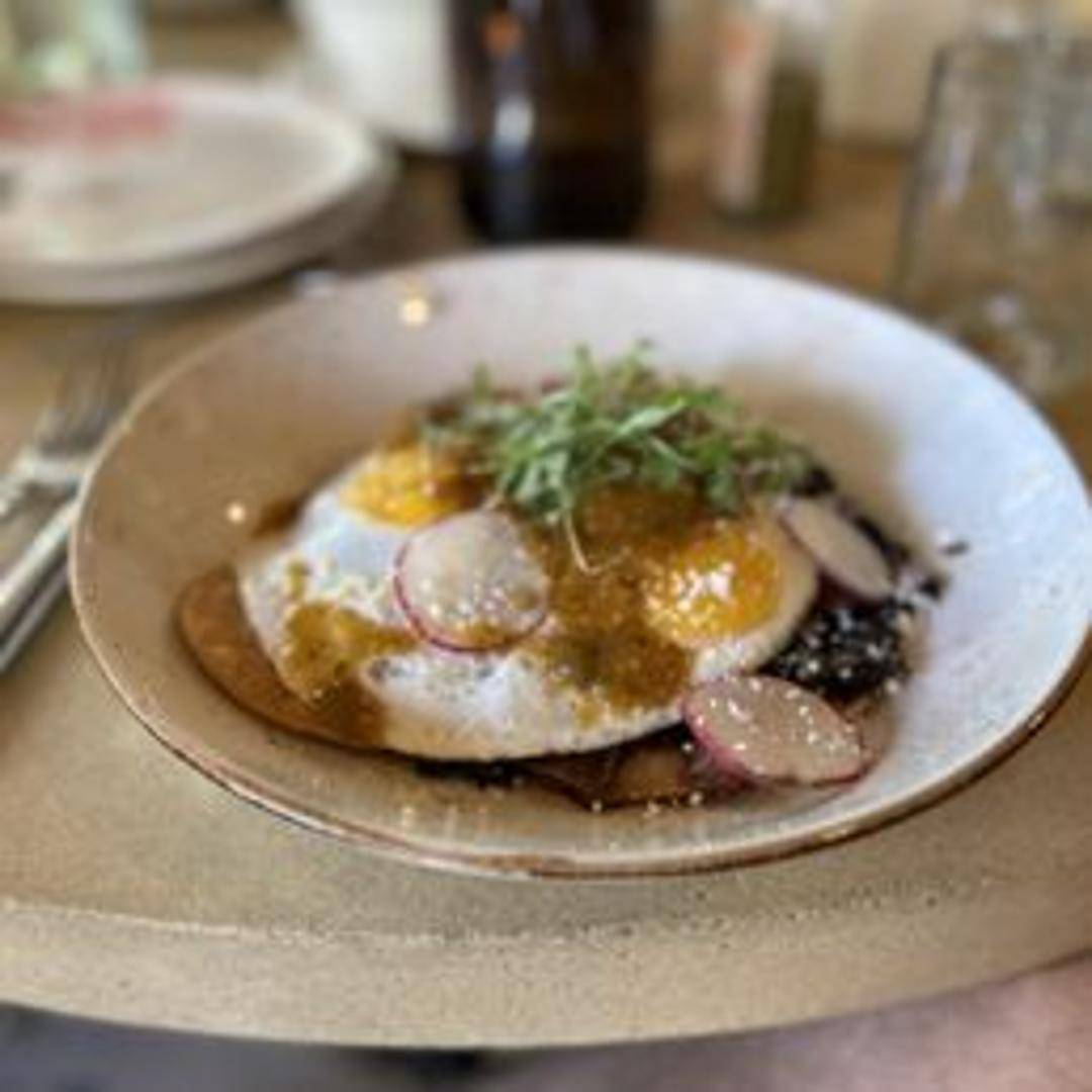 Two fried eggs served on crispy corn tortillas, topped with ranchero sauce, black beans, queso fresco, avocado, and cilantro.