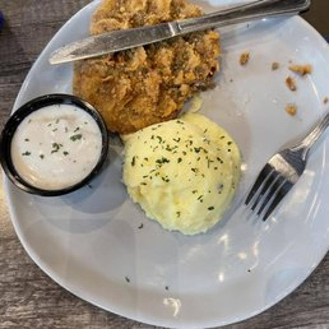 Tender steak breaded and fried to golden perfection, smothered in creamy country gravy. Served with mashed potatoes and your choice of vegetable.