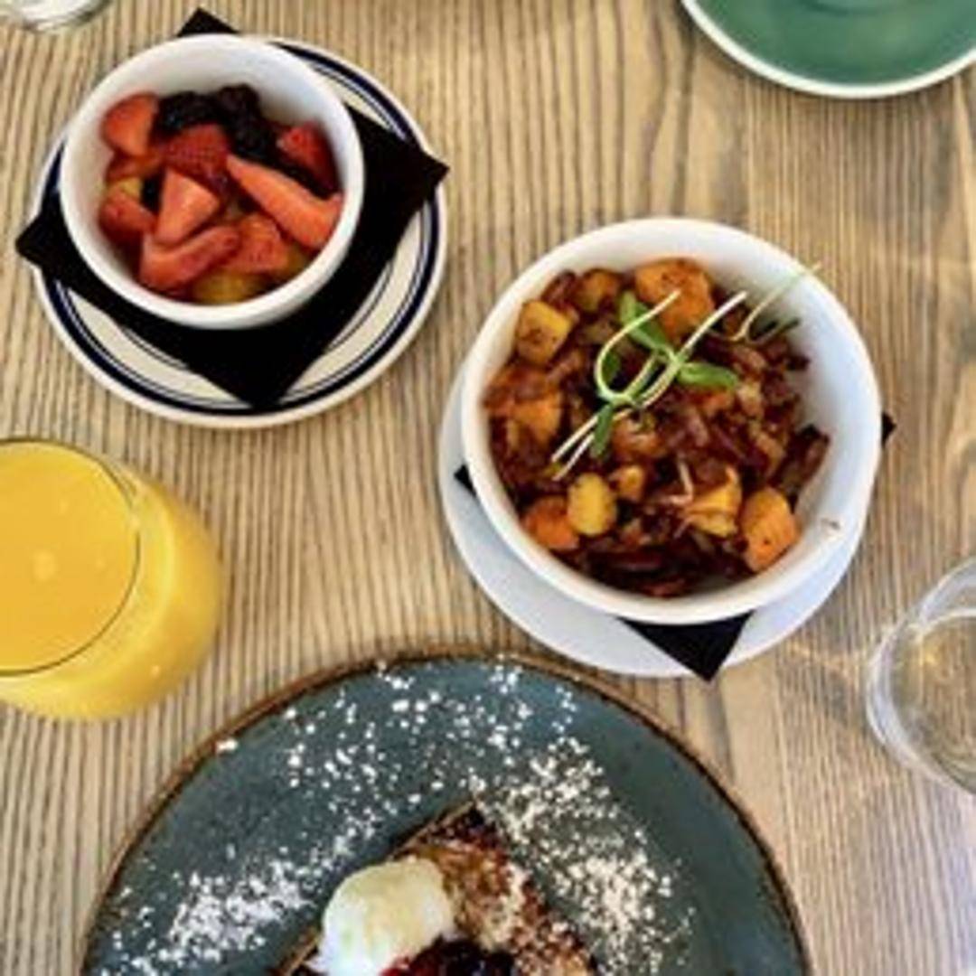 Brioche bread soaked in vanilla custard, grilled golden brown and stuffed with a sweet cream cheese filling. Served with seasonal fruit and your choice of maple syrup or house-made berry compote.