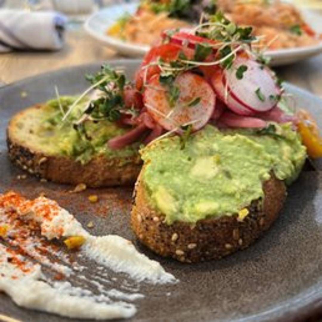 Toasted sourdough bread topped with smashed avocado, everything bagel seasoning, radish slices, microgreens, and a drizzle of olive oil. Served with a side of seasonal fruit.