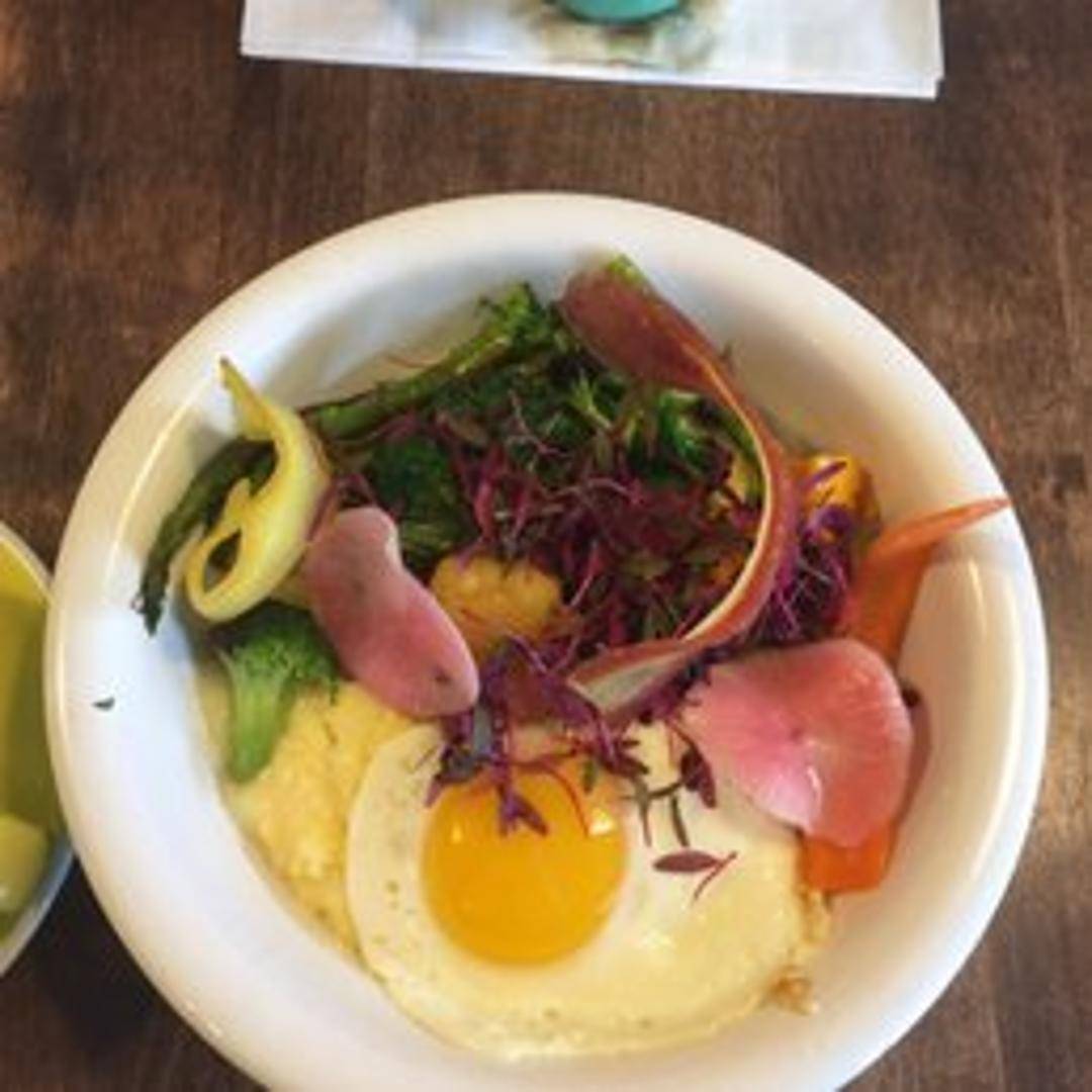 Creamy polenta topped with seasonal roasted vegetables, a poached egg, and finished with a pesto drizzle. May contain dairy and gluten. Vegetarian.