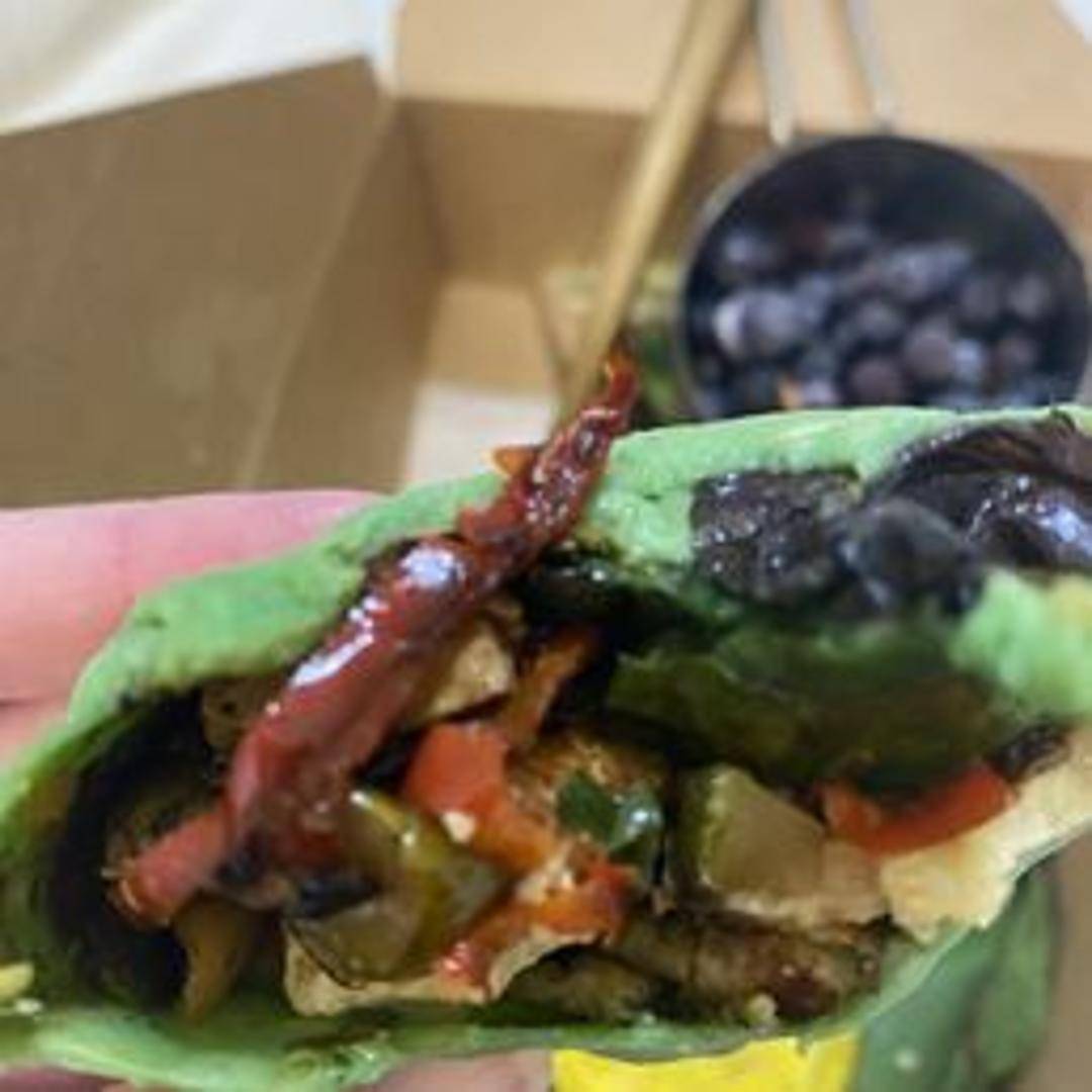 A warm tortilla filled with a medley of grilled seasonal vegetables, featuring bell peppers, zucchini, onions, and eggplant. Enhanced with a flavorful vegan aioli and fresh greens. A light and satisfying plant-based option.
