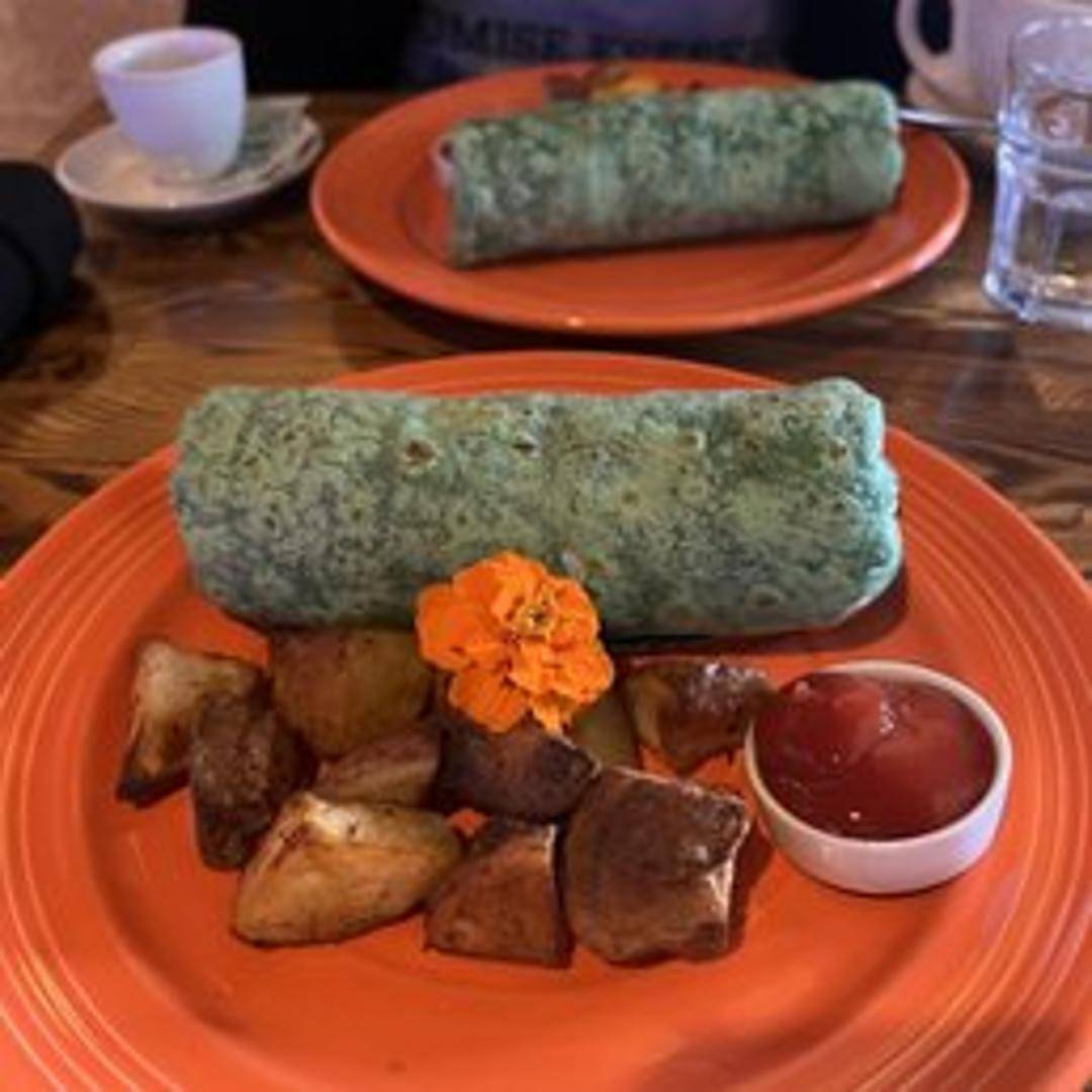 A satisfying breakfast burrito filled with plant-based egg, potatoes, and your choice of toppings (such as cheese, salsa, and avocado) all wrapped in a warm flour tortilla.