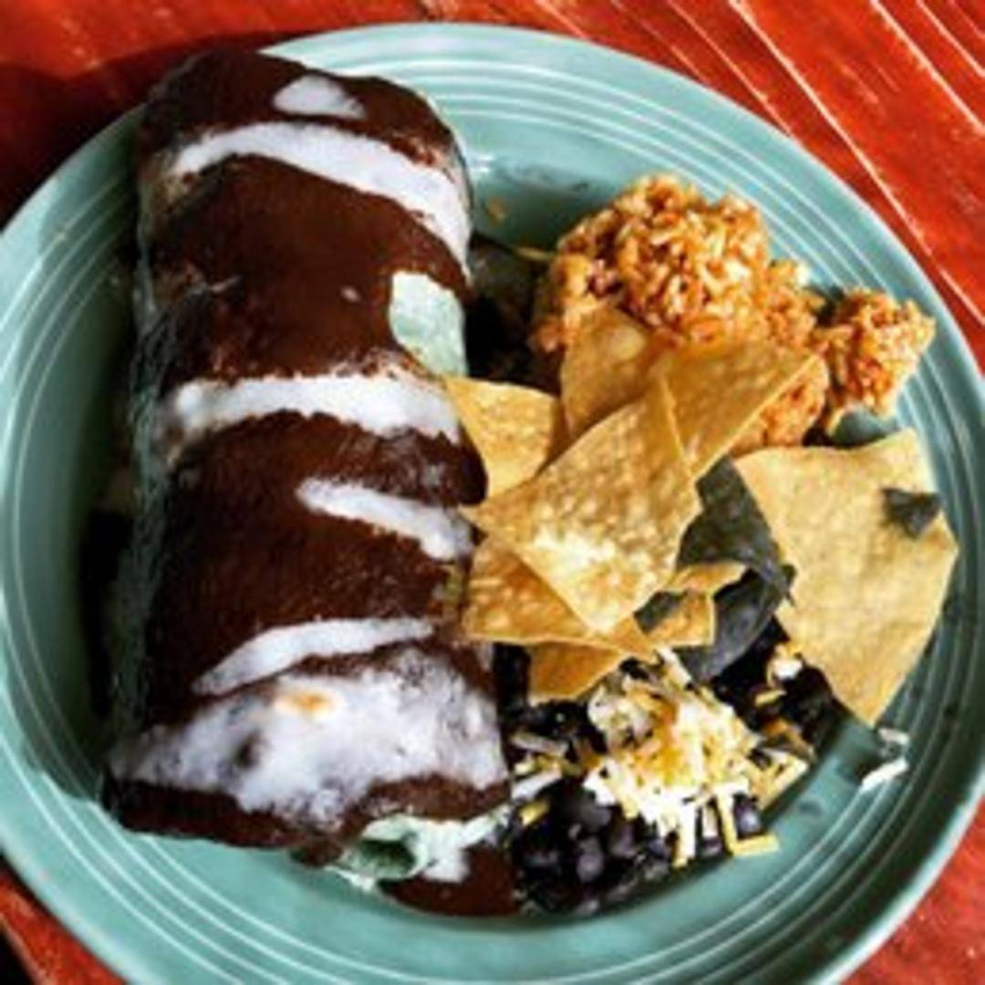 A savory burrito filled with plant-based protein simmered in a rich, complex mole sauce. Includes rice, beans, and your choice of toppings (such as onions, cilantro, and salsa) all wrapped in a warm flour tortilla.