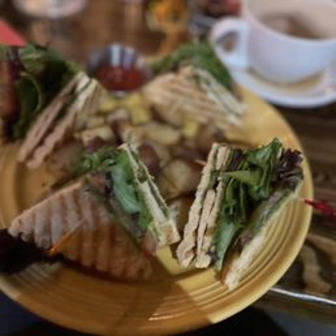 A triple-decker sandwich with layers of toasted bread, plant-based deli slices, lettuce, tomato, and a spread. Served with a side of your choice (fries, salad, or coleslaw).