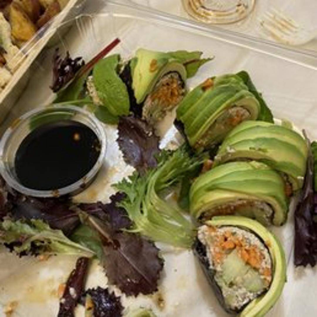 A vegan sushi roll featuring a vibrant combination of avocado, cucumber, and seasoned rice. Topped with a sweet and savory vegan eel sauce and sesame seeds. A delightful and visually appealing plant-based sushi experience.