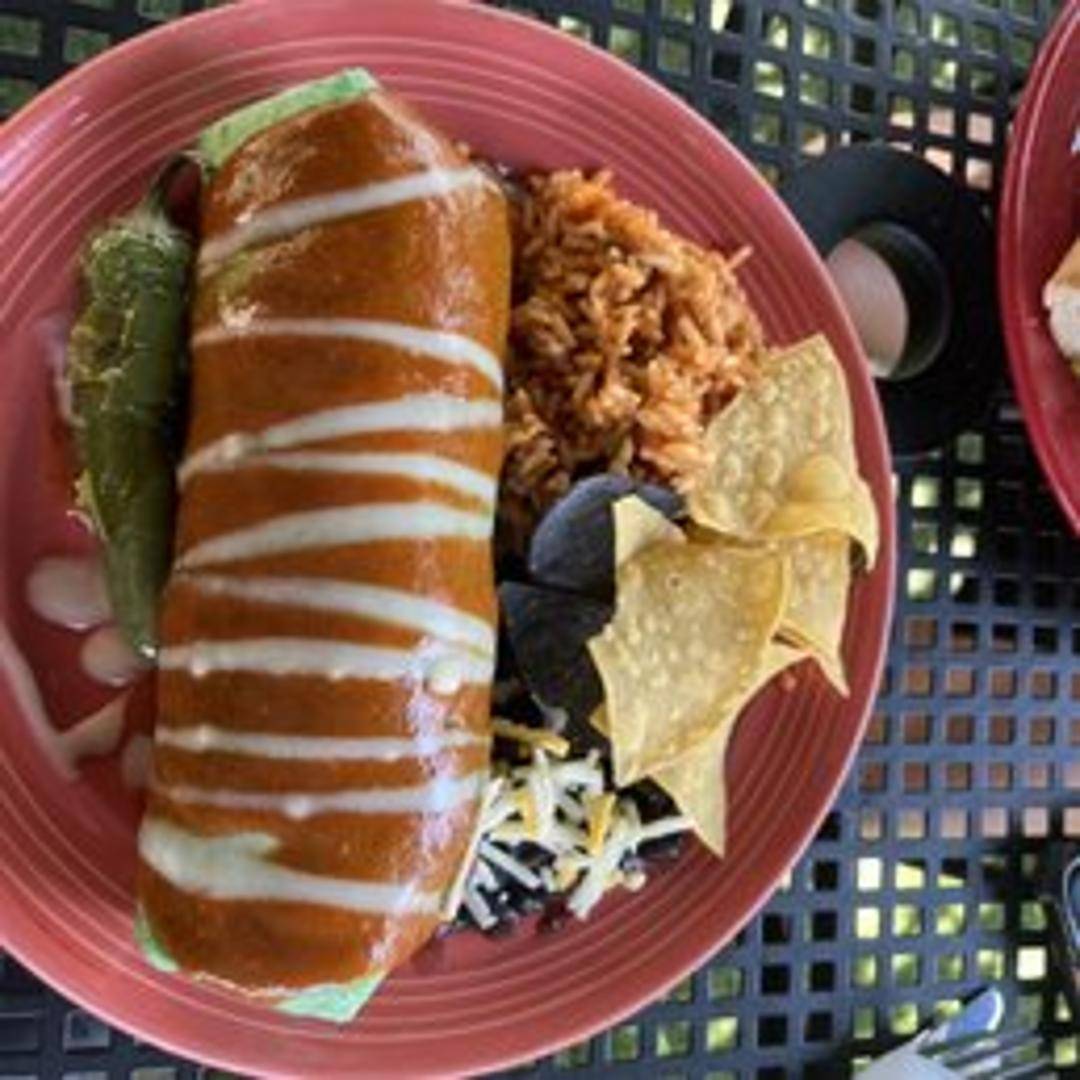 A large burrito filled with your choice of protein, rice, and beans. Smothered in a flavorful sauce and topped with cheese and sour cream.