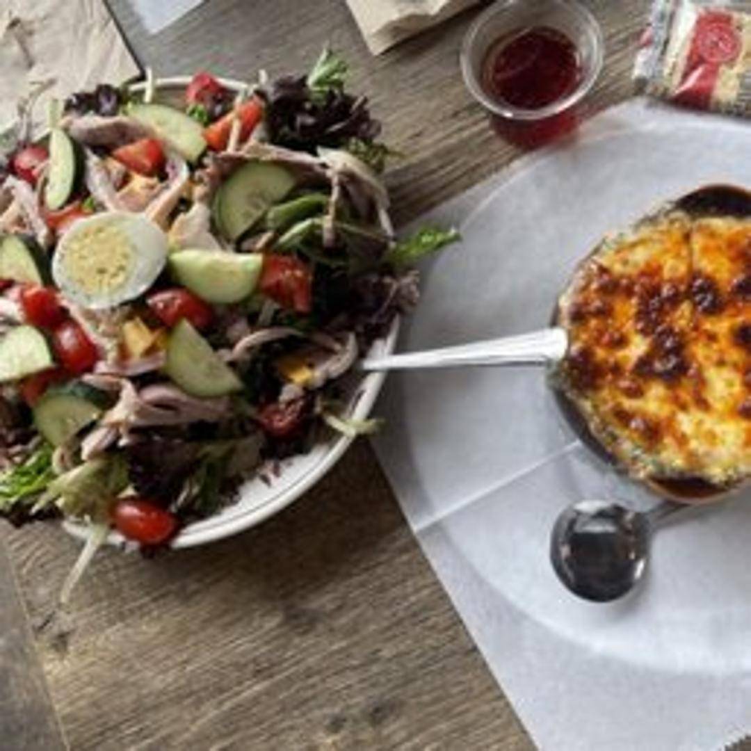 A generous bed of mixed greens topped with sliced ham, turkey, Swiss cheese, cheddar cheese, hard-boiled egg, tomato, cucumber, and your choice of dressing.