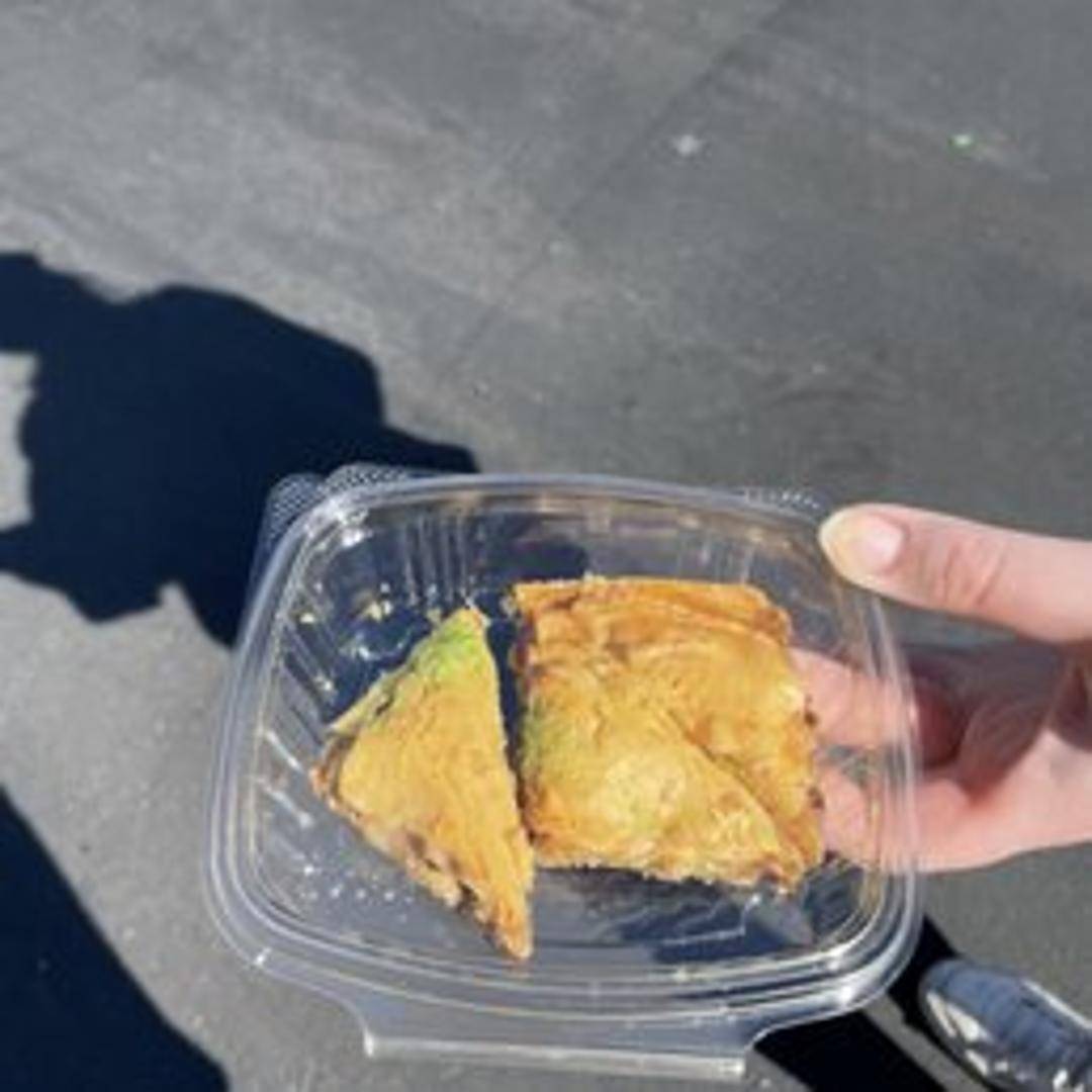 A rich, sweet pastry made of layers of filo dough filled with chopped nuts and sweetened with syrup.