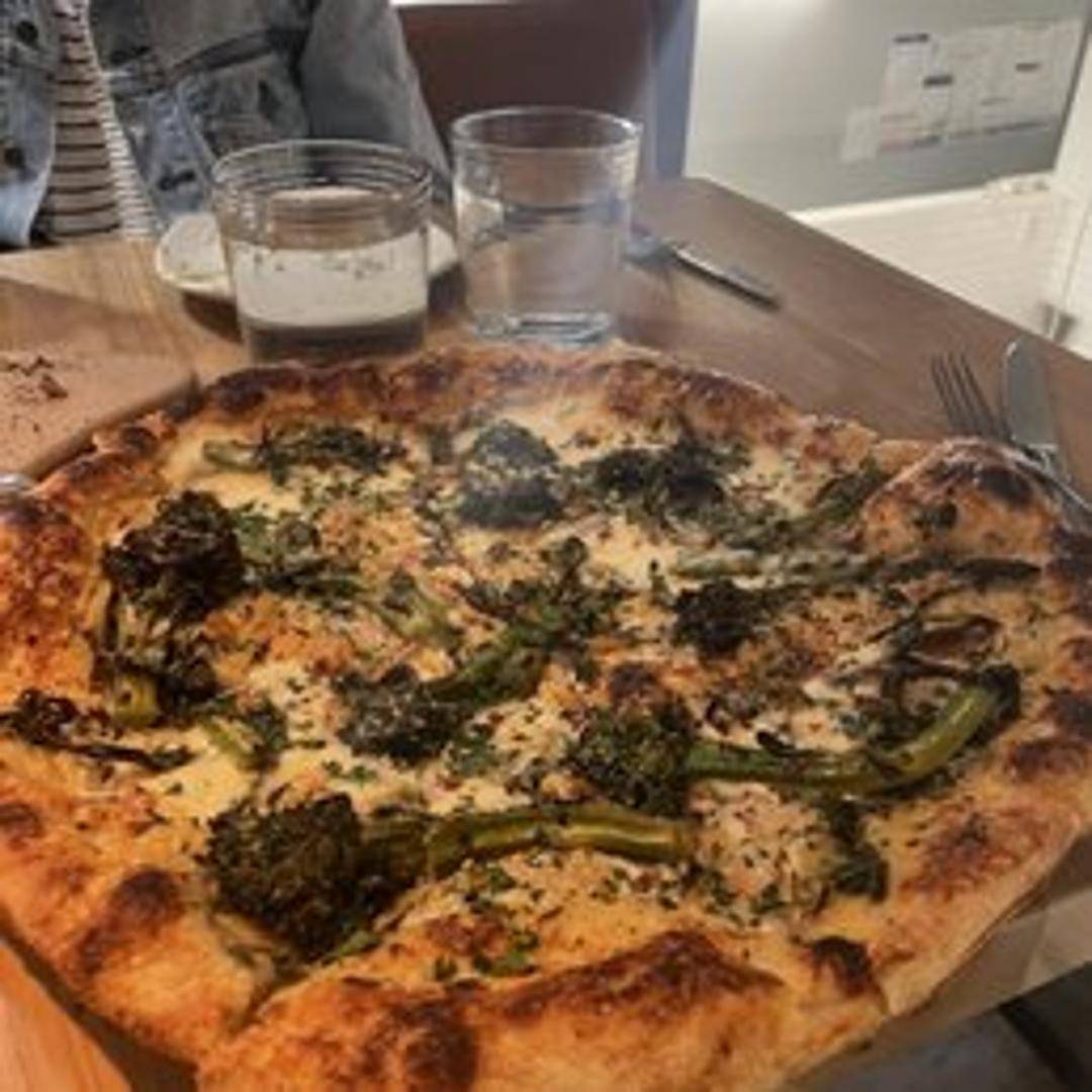 A pizza without tomato sauce, typically featuring a blend of cheeses like ricotta and mozzarella, often seasoned with garlic, herbs, and olive oil.