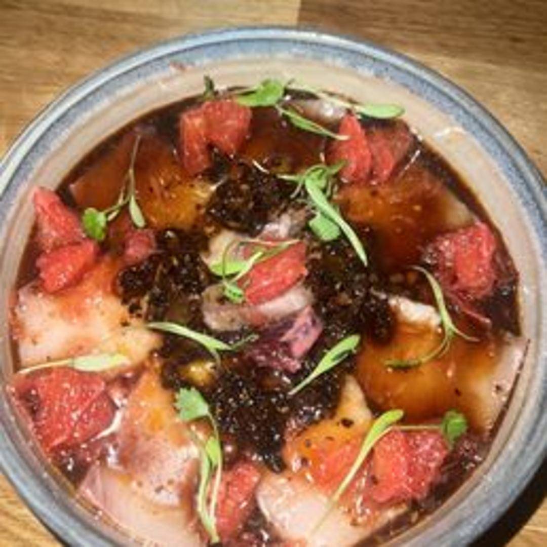Thinly sliced raw hamachi, typically served with a citrus-based vinaigrette or ponzu, and often garnished with chili oil, microgreens, and toasted sesame seeds. May include other complementary ingredients like avocado, radish, or ginger for added texture and flavor.
