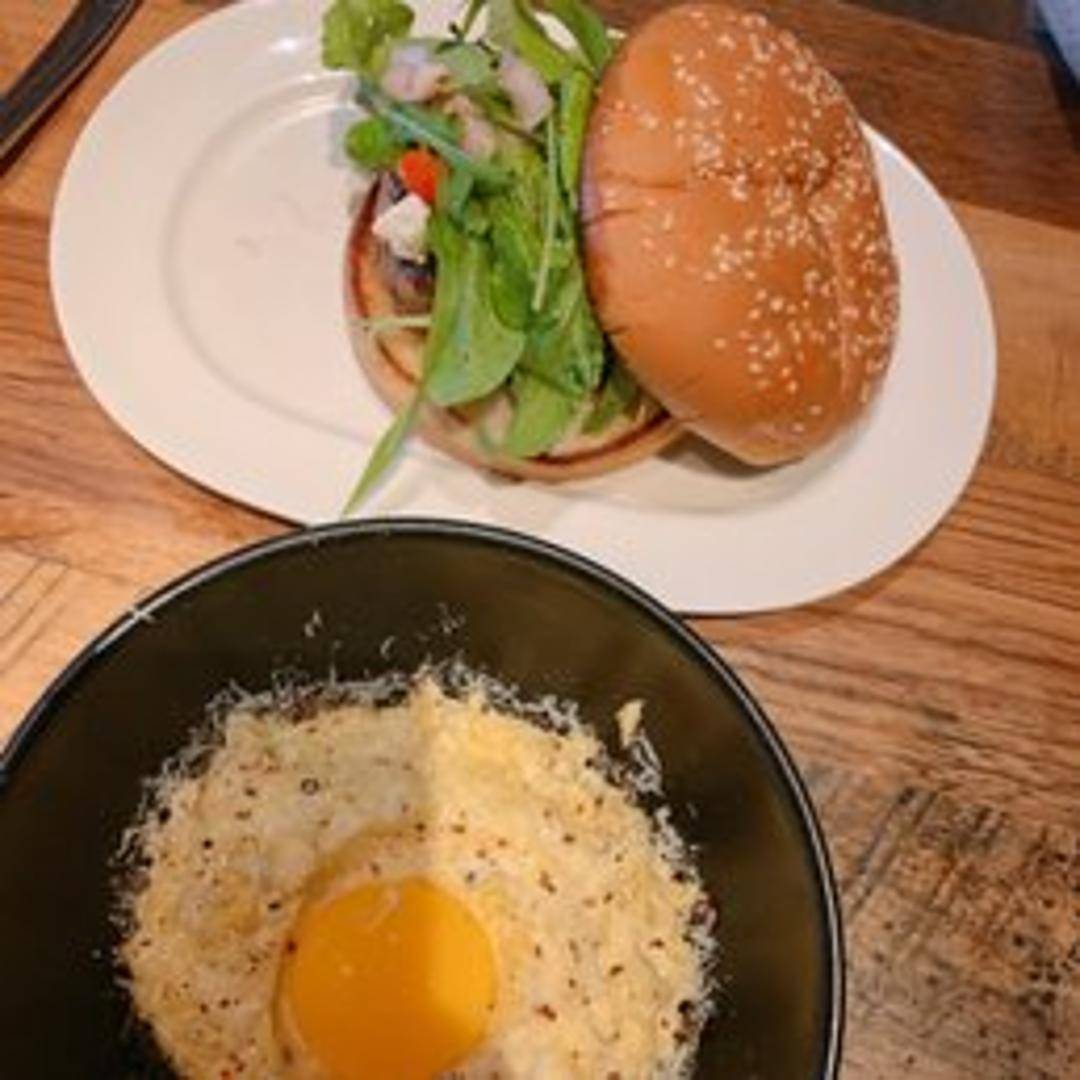 Our elevated Lamb Burger features a perfectly seasoned patty of ground lamb, topped with crumbled feta cheese, caramelized red onions, fresh arugula, and a roasted garlic aioli, all served on a toasted brioche bun.