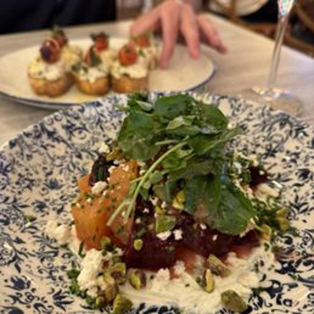Roasted golden beets served over mixed greens with goat cheese, candied pecans, and a lemon vinaigrette.