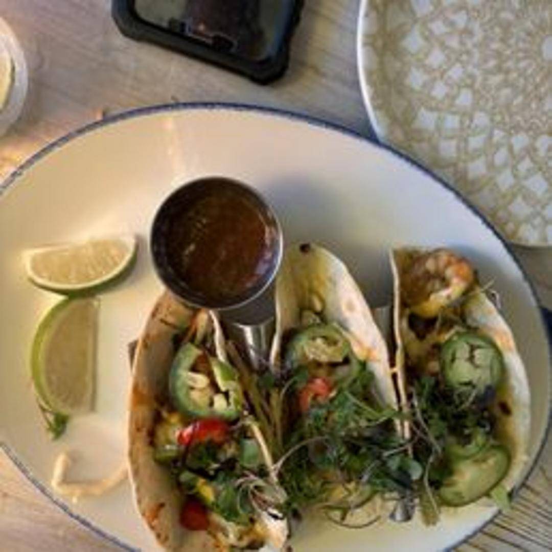Three grilled shrimp tacos with shredded cabbage, pico de gallo, avocado crema, and a side of tortilla chips and salsa.