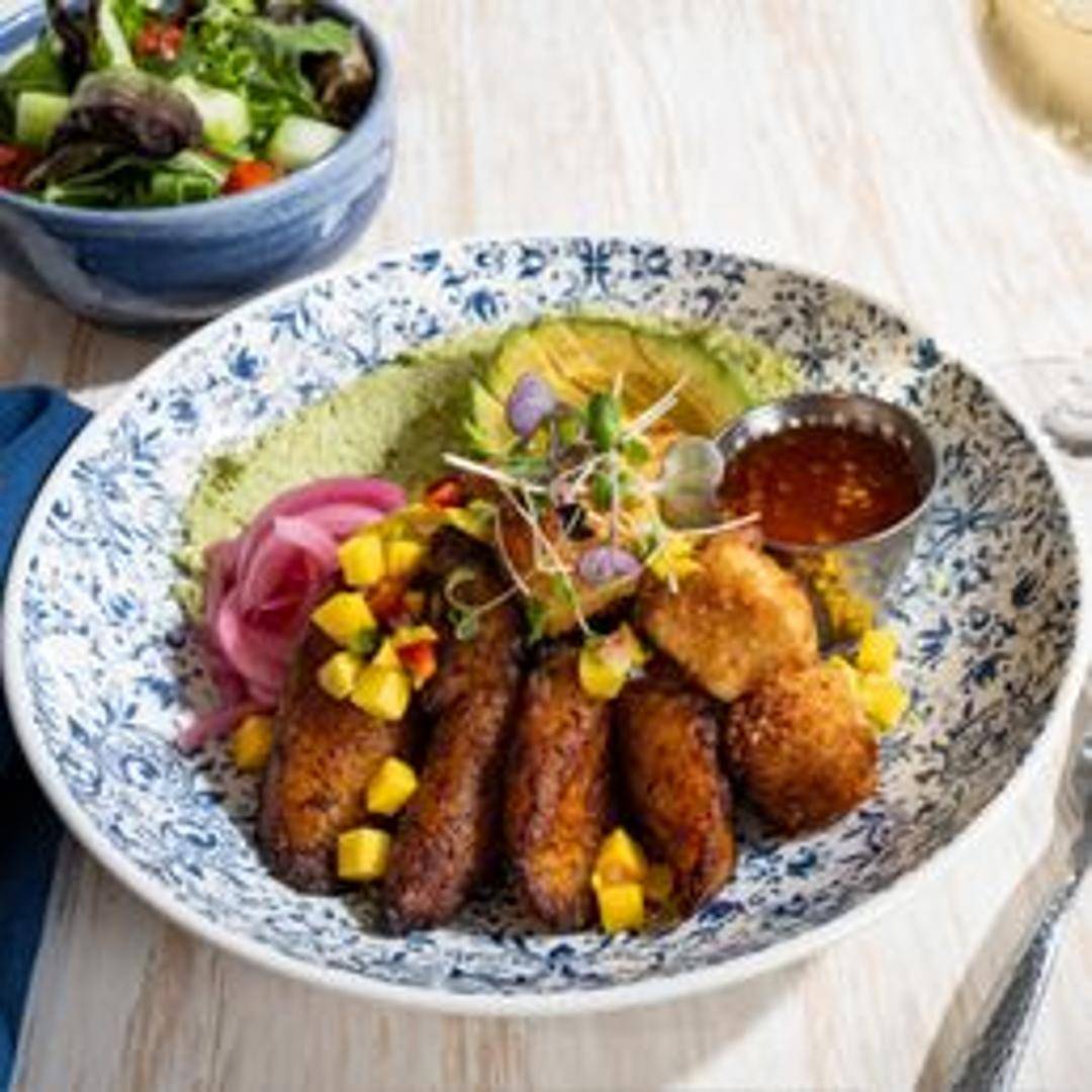 Crispy, coconut-crusted tofu served with a sweet chili dipping sauce and a side of jasmine rice.