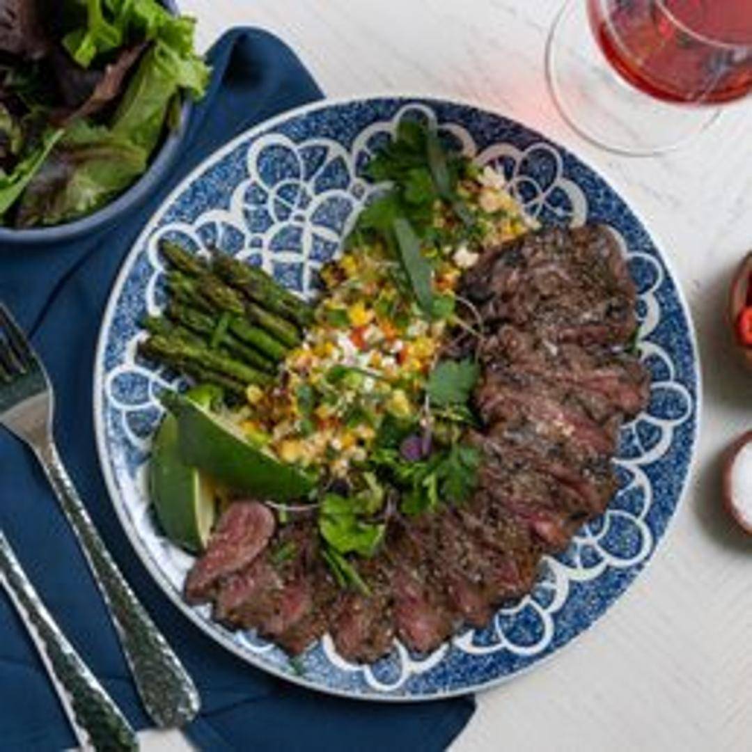 Grilled skirt steak marinated in a balsamic glaze, served with roasted vegetables and a side of mashed potatoes.