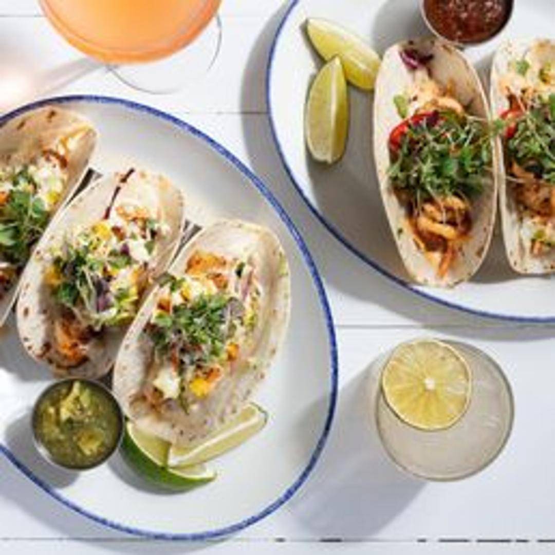 Three crispy battered fish tacos with shredded cabbage, pico de gallo, chipotle mayo, and a side of tortilla chips and salsa.