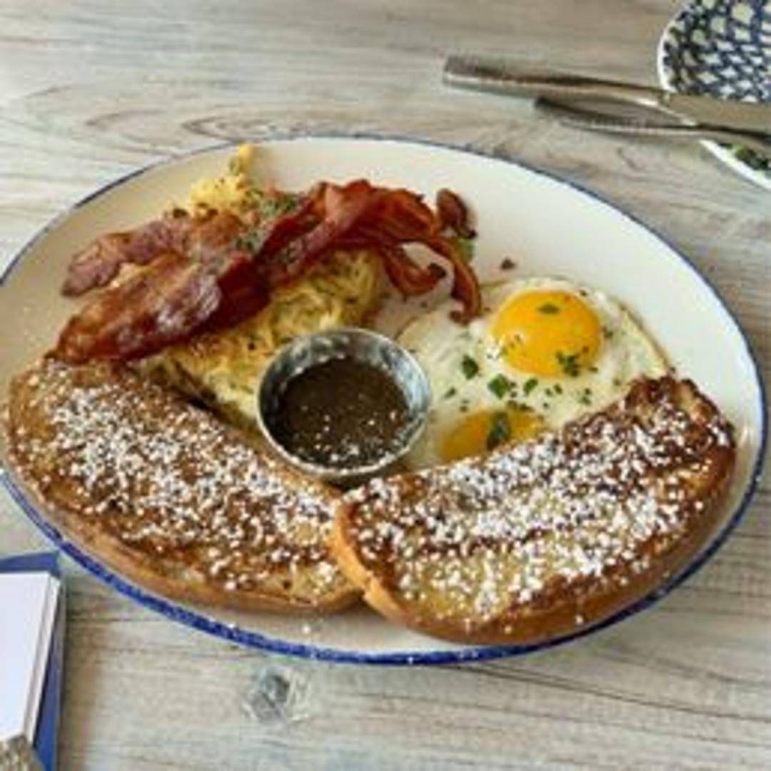 Two eggs any style, choice of bacon or sausage, breakfast potatoes, and toasted multigrain bread.