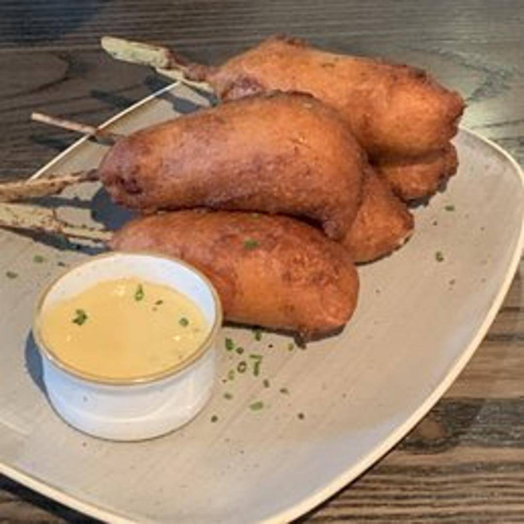 Gourmet corn dogs featuring premium Wagyu beef, encased in a crispy, golden cornmeal batter. Served with a selection of dipping sauces.