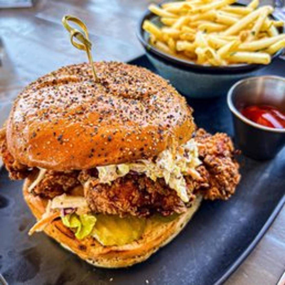 Crispy fried chicken breast served on a toasted bun with a spicy aioli, coleslaw, and pickles.