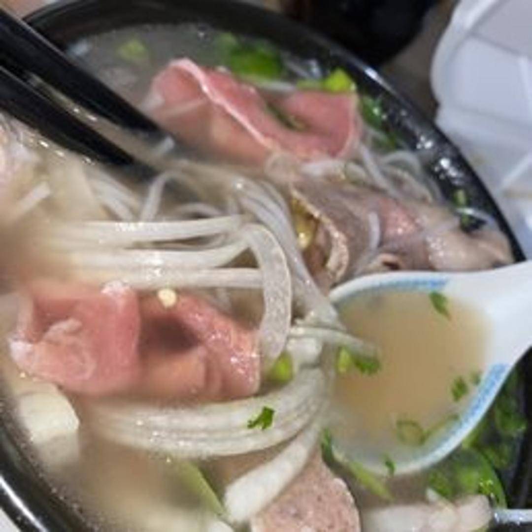 A traditional Vietnamese noodle soup featuring a rich and aromatic broth, rice noodles, and a combination of various sliced meats (such as beef, brisket, meatballs, or tendon). Garnished with fresh herbs, bean sprouts, lime, and chili peppers for customizable flavor.