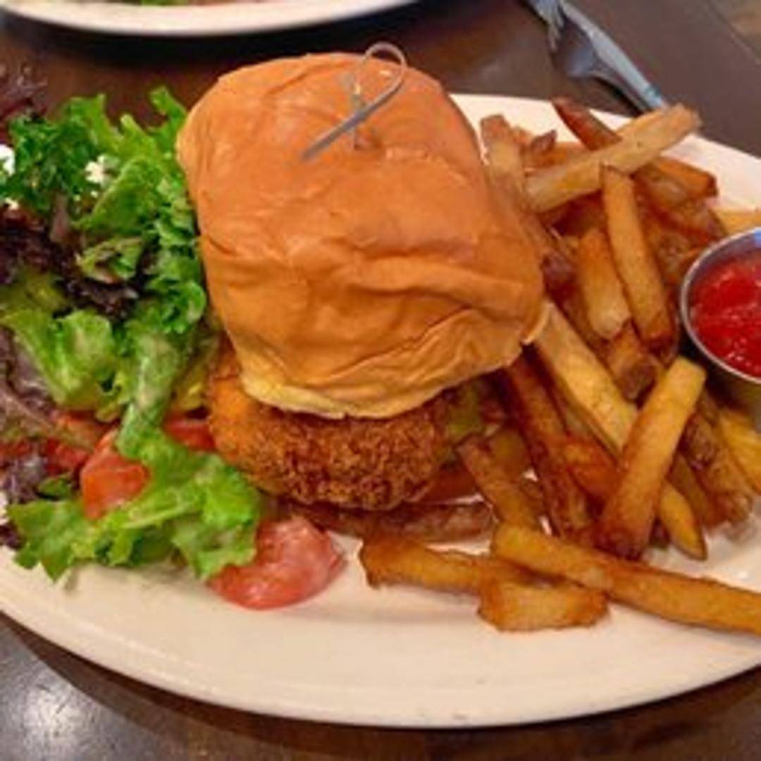 Crispy, juicy fried chicken breast served on a toasted brioche bun. Topped with crunchy slaw, dill pickles, and a spicy aioli.