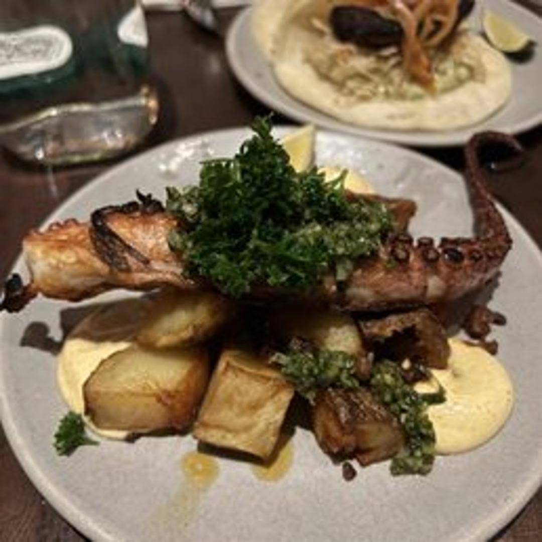 Tender, grilled octopus served with [Chef's choice accompaniments: e.g., roasted potatoes, olives, capers, or a Mediterranean-inspired salad]. Seasoned with herbs and spices, and drizzled with [Chef's choice oil: e.g., olive oil and lemon vinaigrette]. Expect a flavorful and slightly smoky taste experience with a satisfying texture.