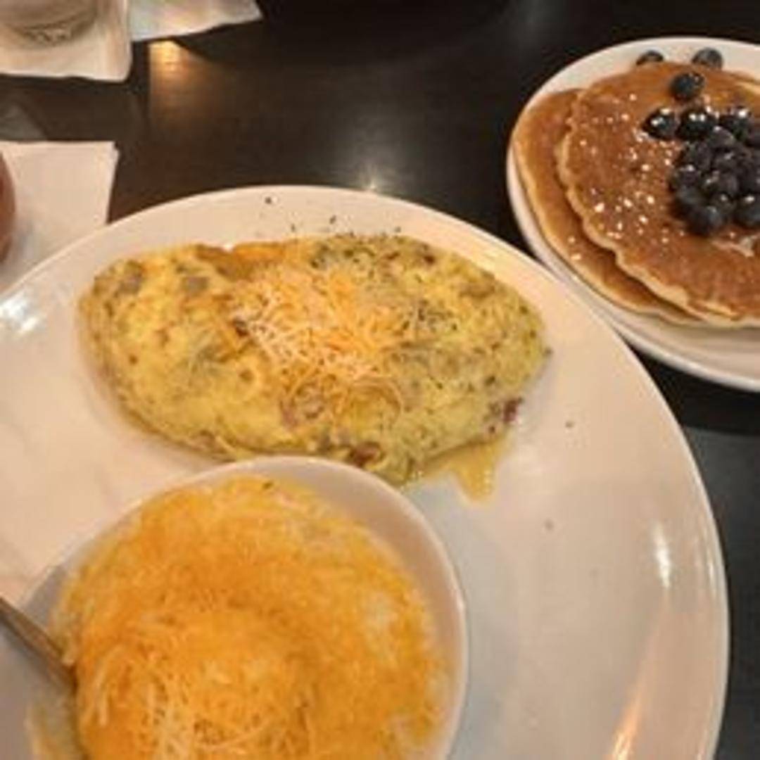 A three-egg omelette filled with a choice of three meats (bacon, ham, sausage), three cheeses (cheddar, Swiss, mozzarella), and three vegetables (onions, peppers, tomatoes). Served with your choice of side.