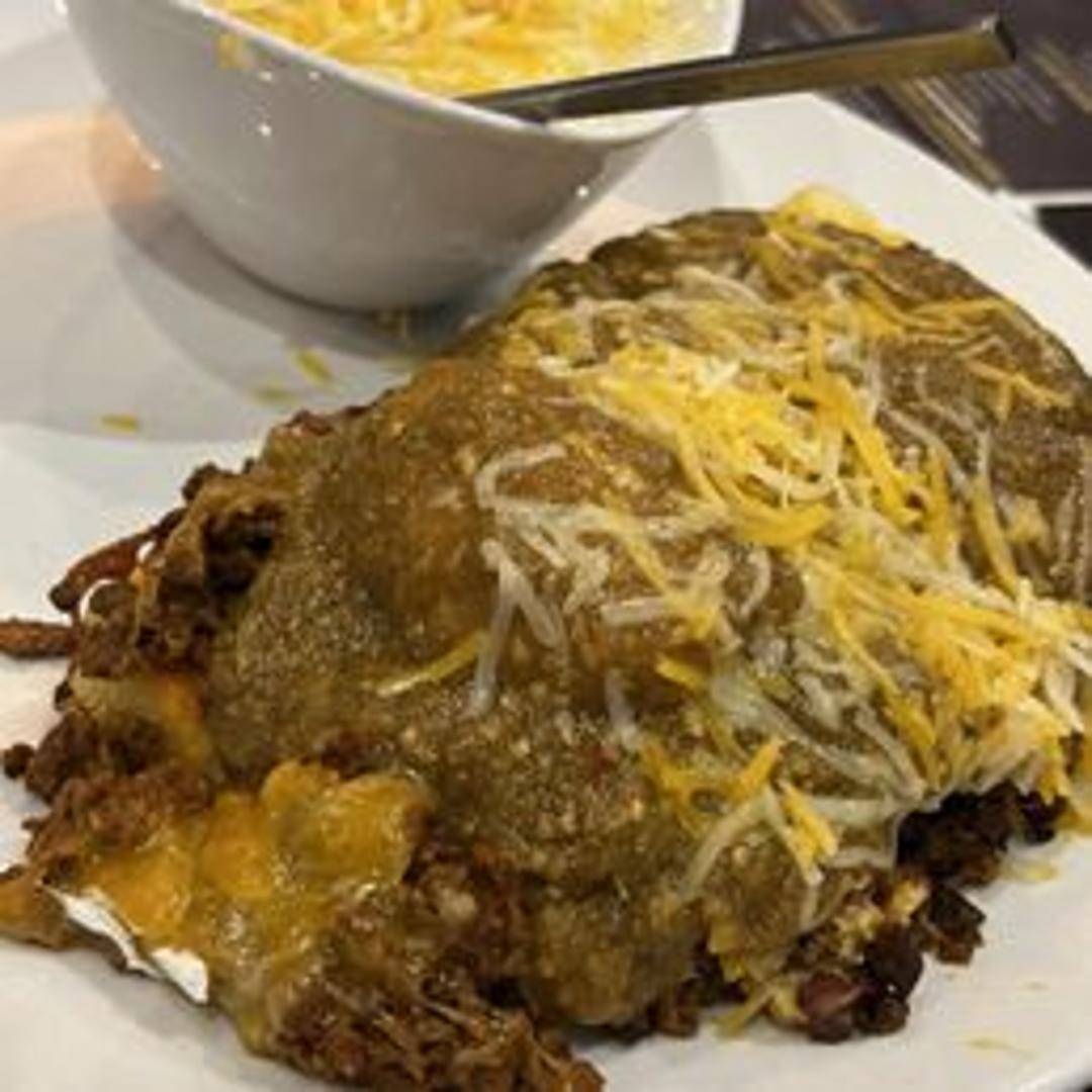 Two poached eggs atop Andouille sausage patties and cornbread, smothered in a spicy Cajun hollandaise sauce, garnished with green onions.
