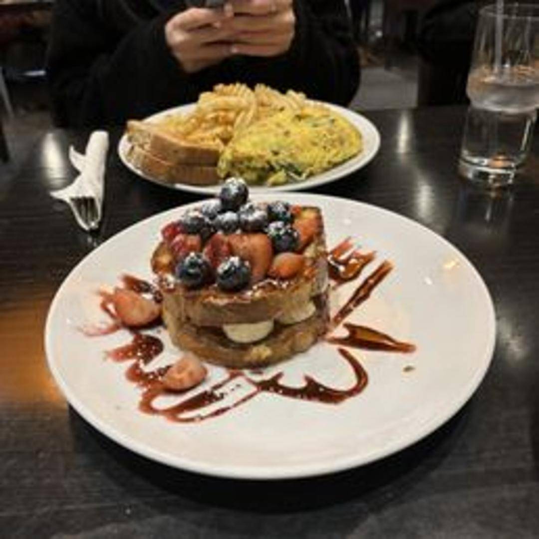 Brioche French toast stuffed with a sweet cream cheese filling and mixed berries, topped with a berry compote and whipped cream.