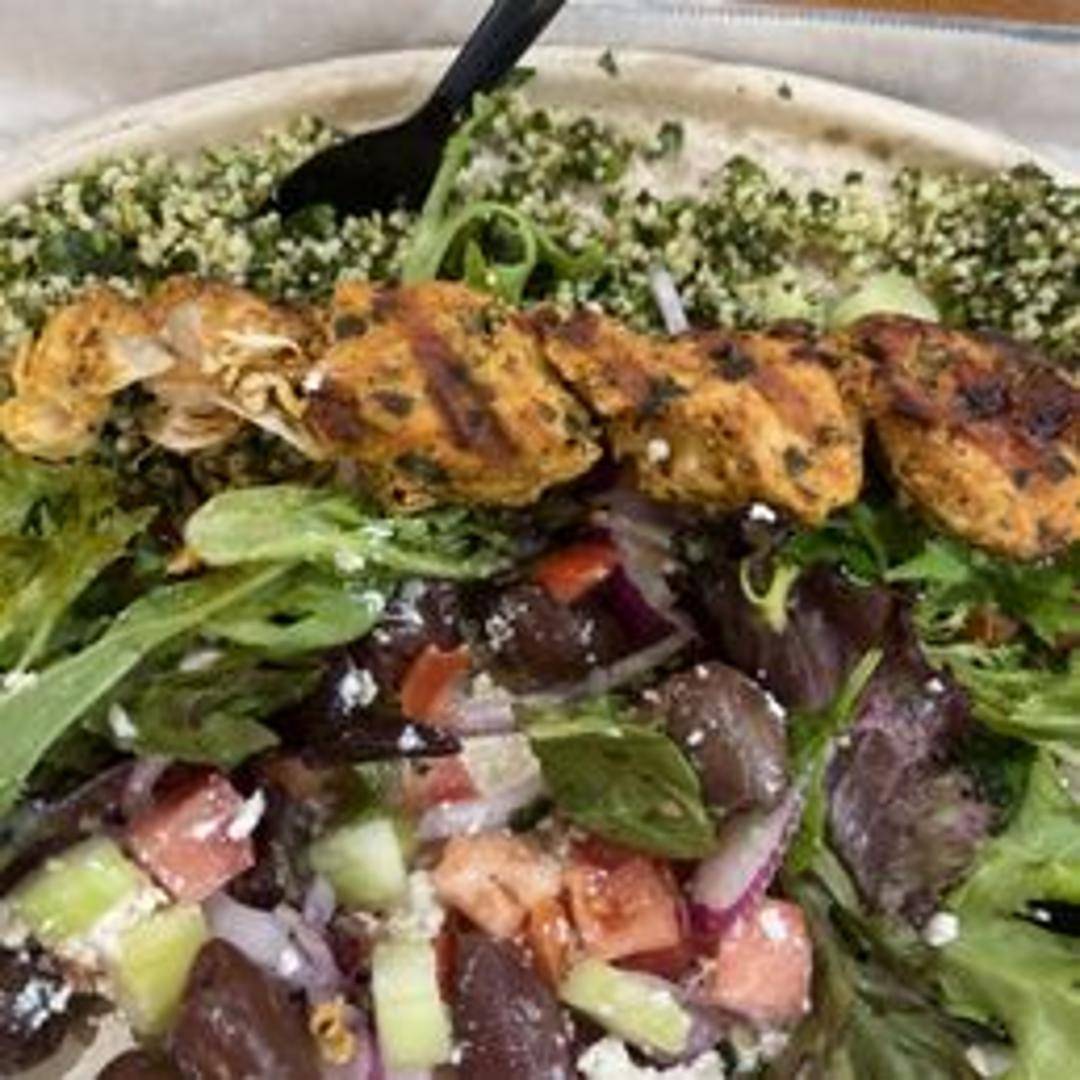 Tender marinated steak kebab, grilled to perfection and served on a bed of fluffy rice. Accompanied by fresh greens, sliced tomatoes, onions, and your choice of sauce.