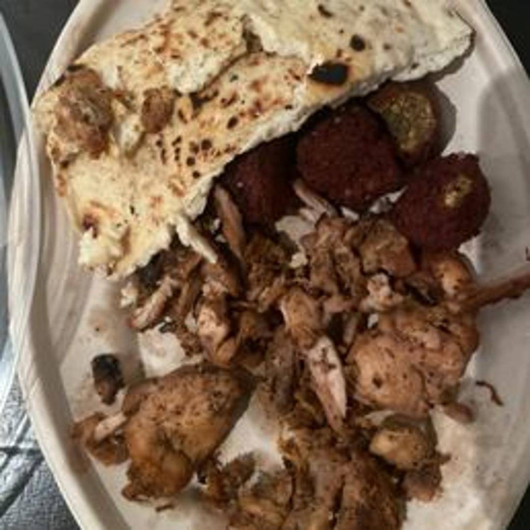 Slow-cooked, marinated, and carved chicken. Usually served as a standalone meat option or as a component for other dishes. Prepared using traditional kebab shop methods.