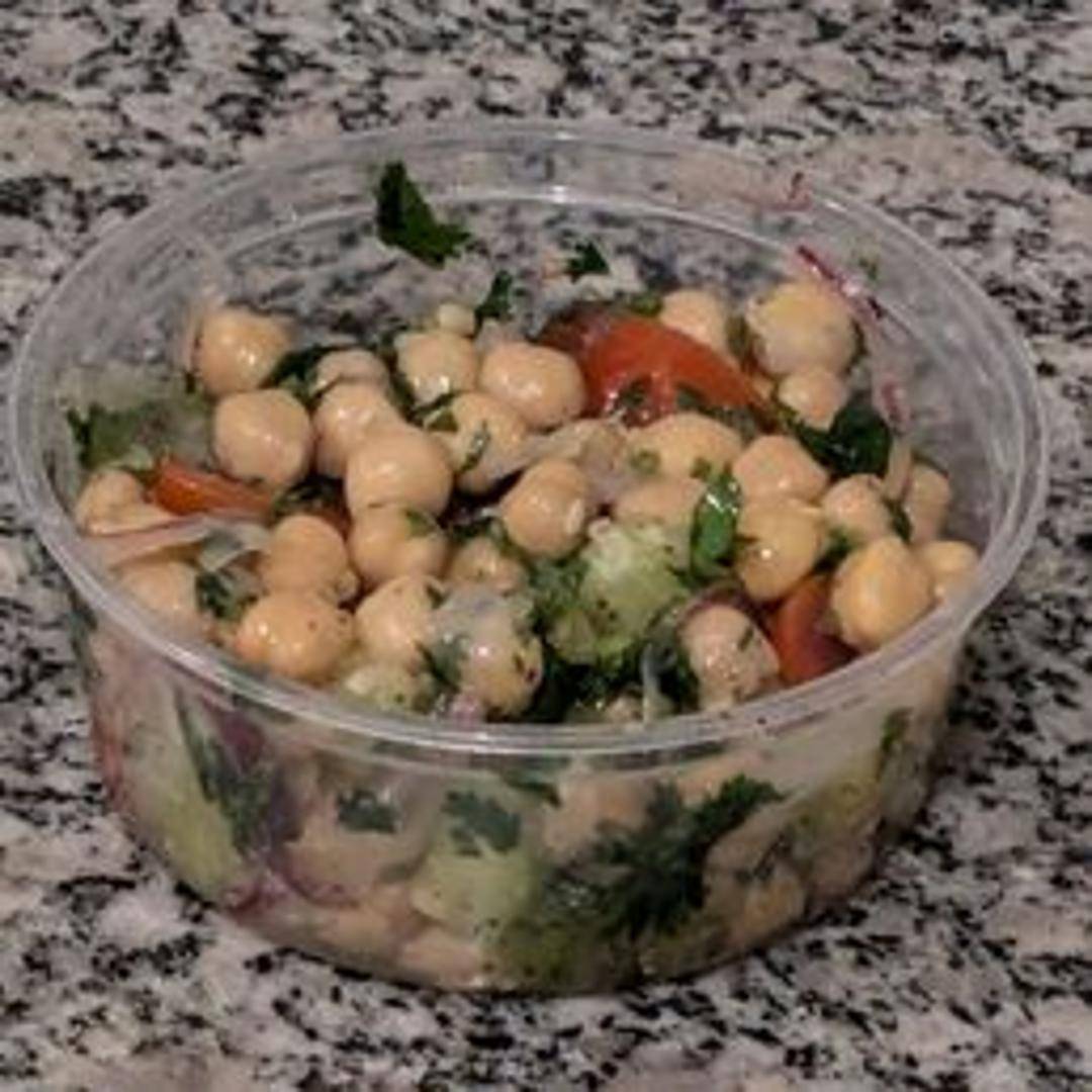A refreshing and flavorful salad featuring seasoned chickpeas, diced vegetables like cucumbers, tomatoes, onions, and parsley, tossed in a light vinaigrette dressing.