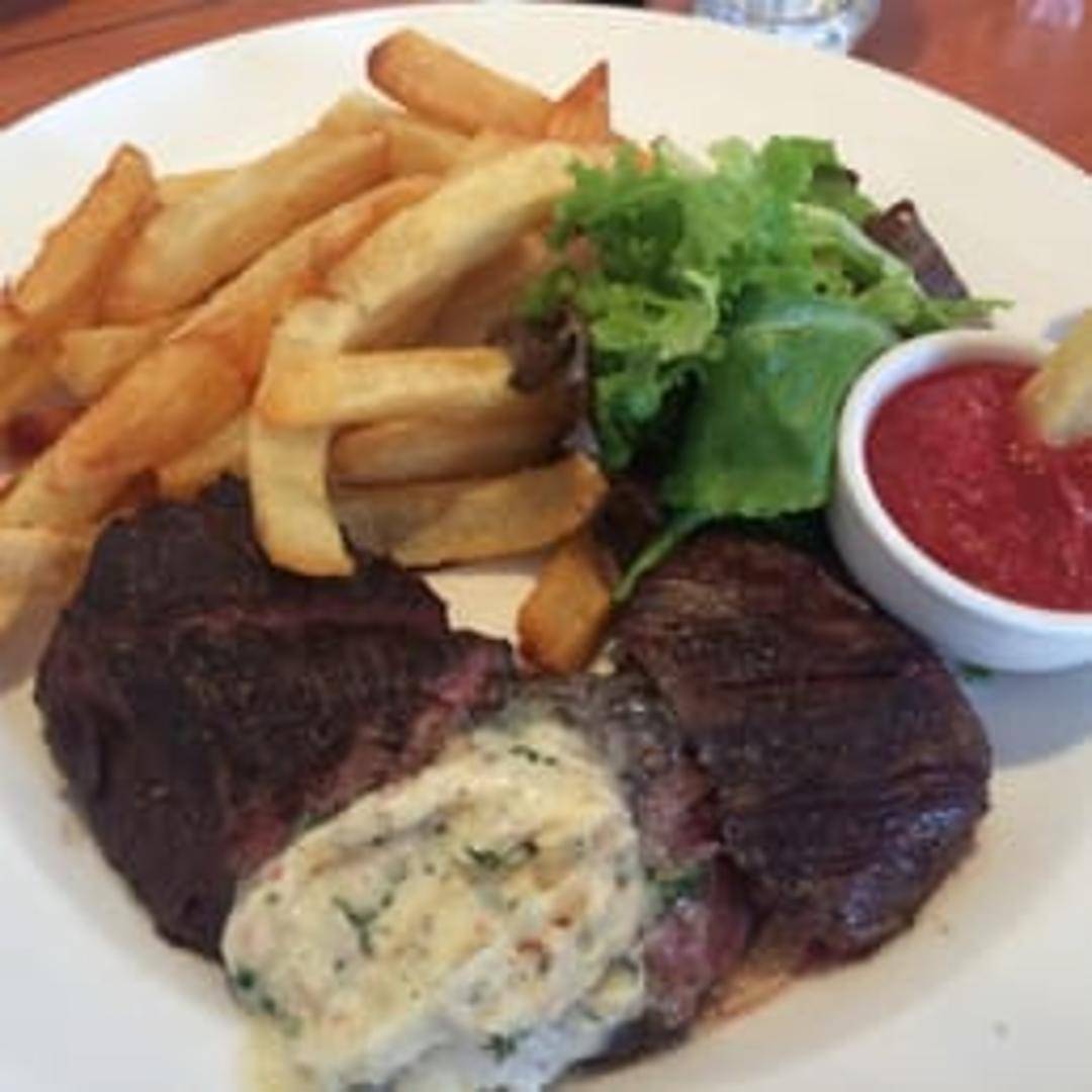 A classic bistro dish featuring a grilled steak, typically a flavorful cut like a hanger or flatiron, served with a generous portion of crispy, golden french fries. Often accompanied by a flavorful sauce, such as béarnaise or au poivre.