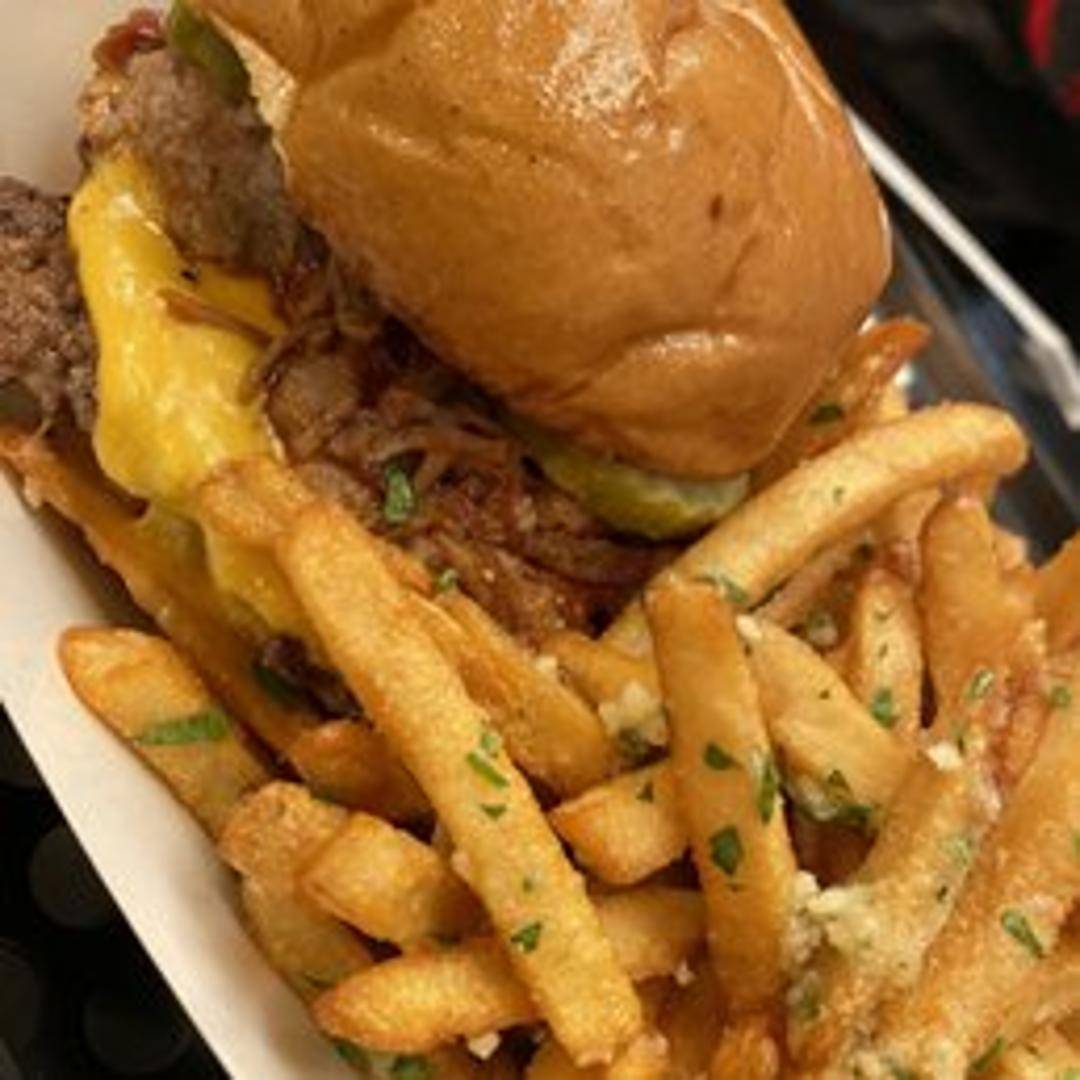 A juicy Wagyu beef patty smashed thin and topped with slow-cooked BBQ pulled pork, melted cheese, and your choice of toppings on a toasted bun.