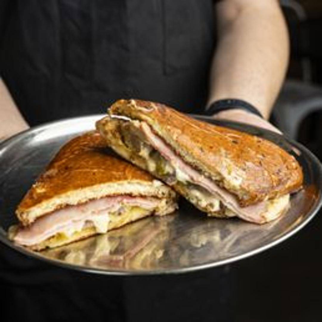 Roasted pork, ham, Swiss cheese, pickles, and mustard pressed on Cuban bread until golden brown and crispy.