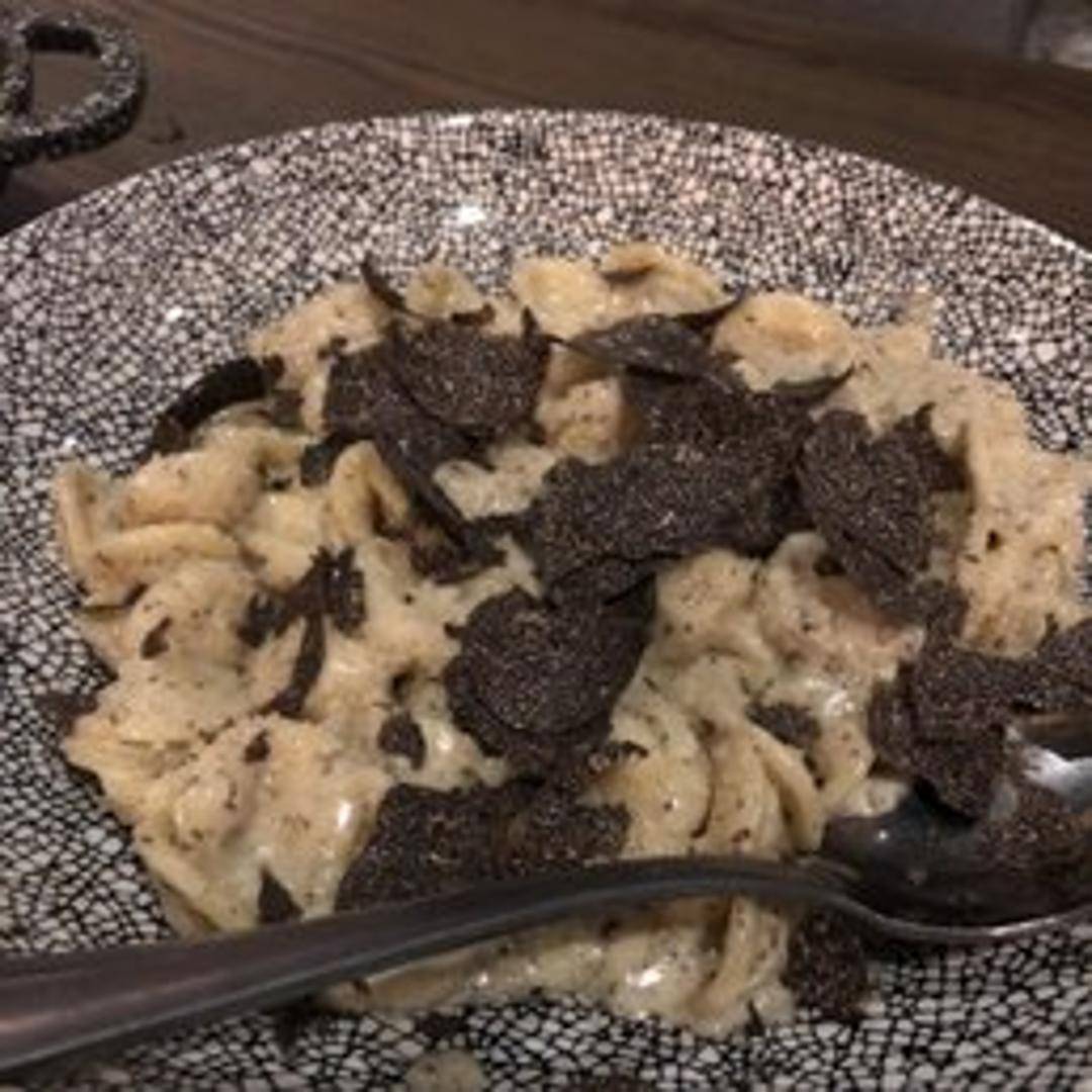 An exquisite pasta dish featuring al dente fresh pasta, delicately coated in a luxurious, creamy sauce infused with the earthy aroma and distinctive flavor of black truffle. Finished with a touch of freshly grated Parmesan and a sprinkle of chives, this dish offers an elegant and aromatic culinary experience.