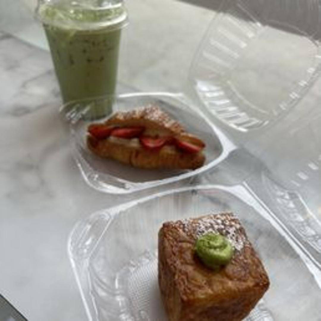 A unique cube-shaped croissant infused with matcha green tea. Features a vibrant green color and a subtly bitter, earthy flavor that complements the buttery layers of the croissant.